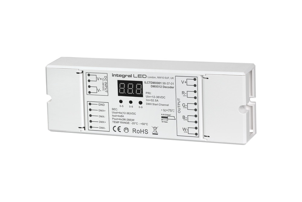 The Integral DMX512 Decoder is compatible with a standard DMX512 master controllers.
